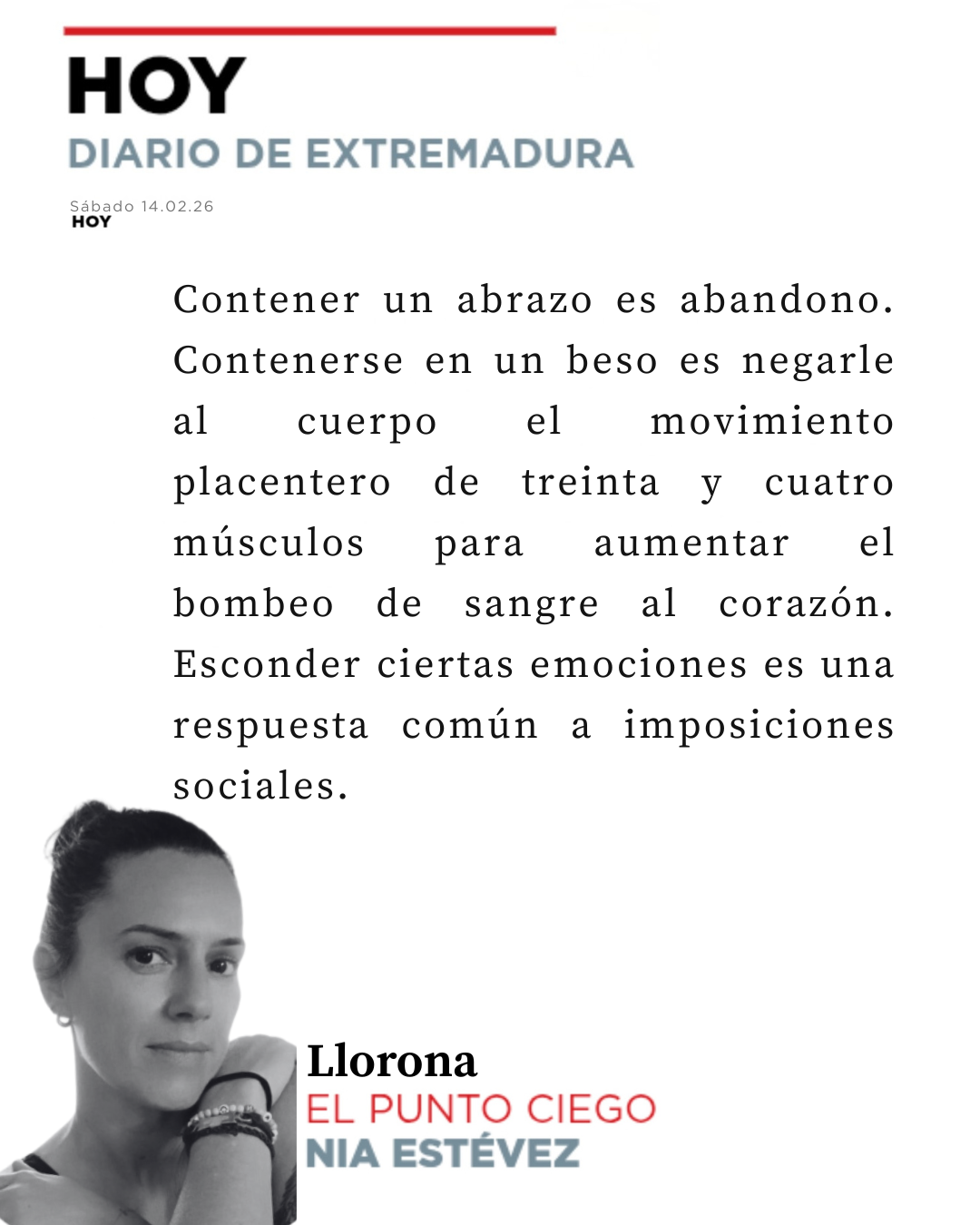 Pero contener un sollozo es ahogarse en uno mismo. Contener un abrazo es abandono. Contenerse en un beso es negarle al cuerpo el movimiento placentero de treinta y cuatro músculos para aumentar el bombeo de sangre al corazón. Esconder ciertas emociones es una respuesta común a imposiciones sociales. Yo pienso dejarme llevar siempre.