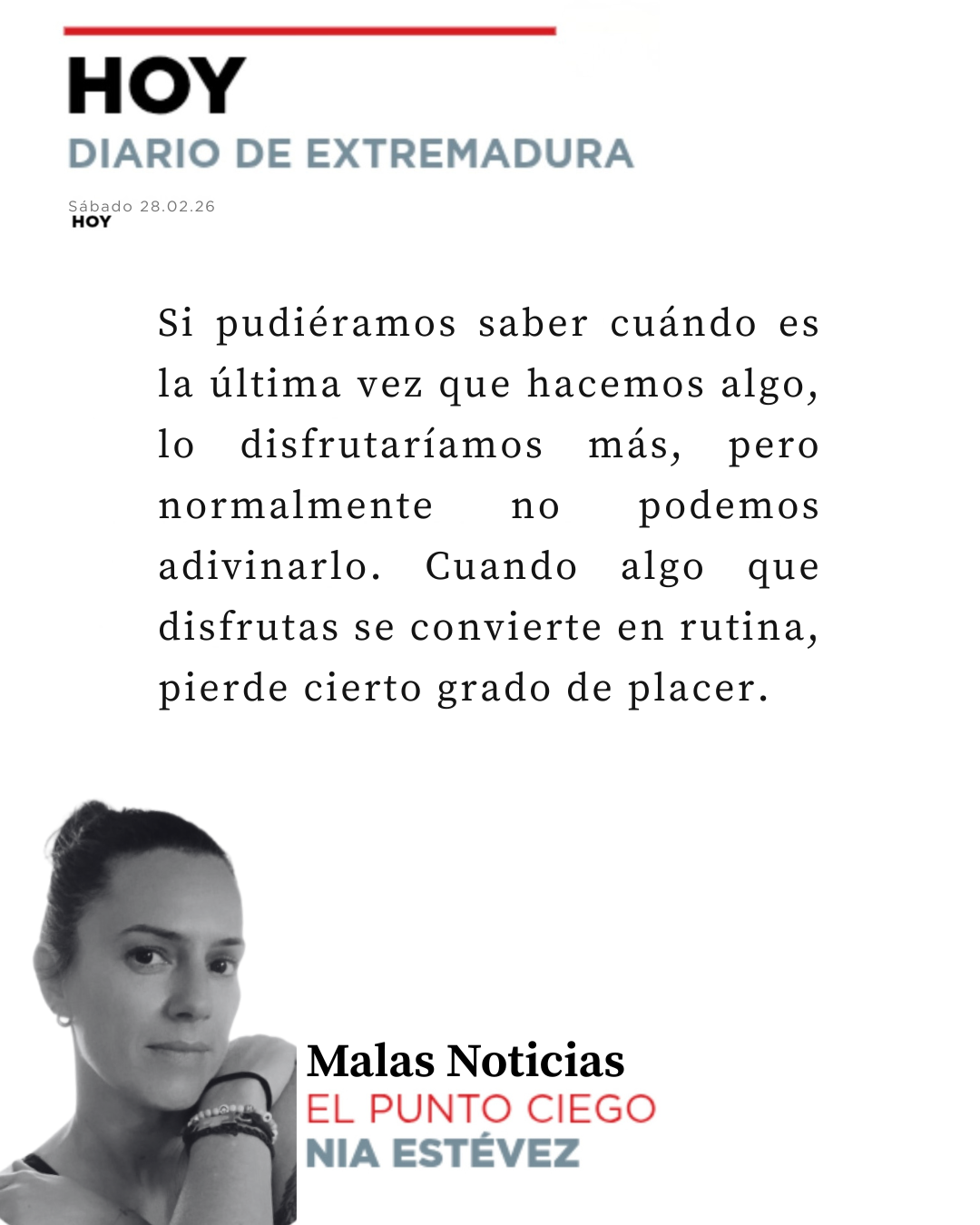Si pudiéramos saber cuándo es la última vez que hacemos algo, lo disfrutaríamos más, pero normalmente no podemos adivinarlo. Cuando algo que disfrutas se convierte en rutina, pierde cierto grado de placer. Eso es normalmente, pero en otras ocasiones hay avisos no concisos que nos ponen en alerta y nos obligan a plantearnos nuestras acciones como si fueran las últimas, aunque en realidad no esté claro.